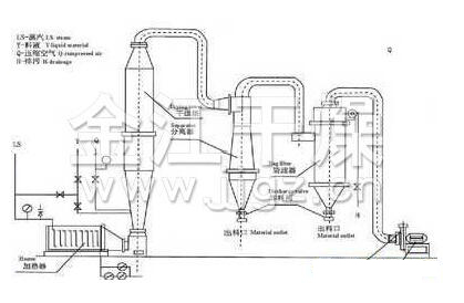 將壓(yā)縮空氣或者是水(shuǐ)蒸汽用(yòng)≥300m/s的速度從噴(pēn)嘴噴出,靠氣液兩(liǎng)者間的速度差產生的摩擦力,使液料分離成細小的霧滴。霧滴與熱空氣的充分接觸並經行熱交換,在10-30秒內迅速完成整個幹燥(zào)過程。