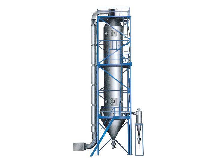 本機組工作過程(chéng)為(wéi)料液通過隔膜泵高壓輸入,噴出霧狀液滴(dī),然後同熱空氣並流下降,大部分粉粒由塔底(dǐ)排料口收(shōu)集,廢氣及其(qí)微小粉(fěn)末經旋風分離器分離,廢氣由抽風機排出,粉末由設在旋風分離器下端的授粉筒收集,風機出口還可(kě)裝備(bèi)二級除塵裝置,回收率在96-98%以上。