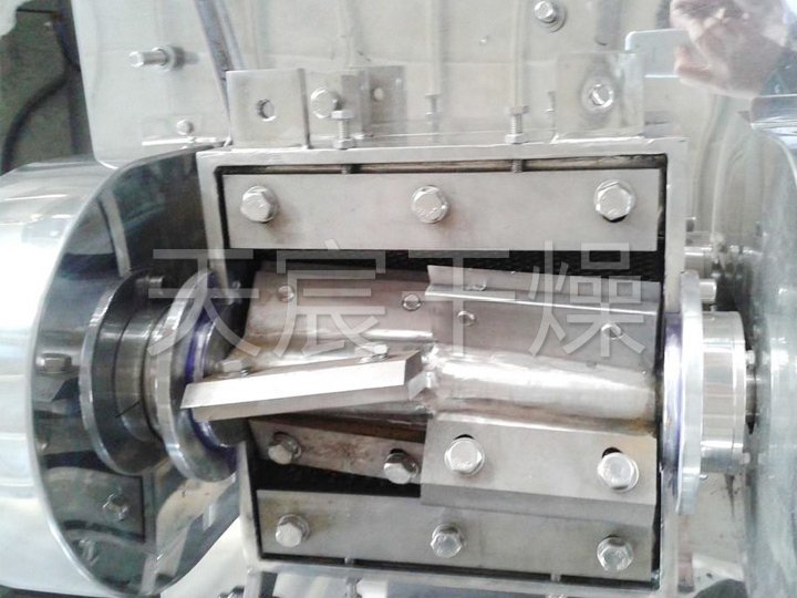 物料由進料鬥送進粉碎室,經刀刃和刀座的衝擊,旋轉刀和(hé)固定(dìng)刀同時剪切粉碎,由於受到旋轉(zhuǎn)離心力的作用,物料(liào)自動從出口處流出。